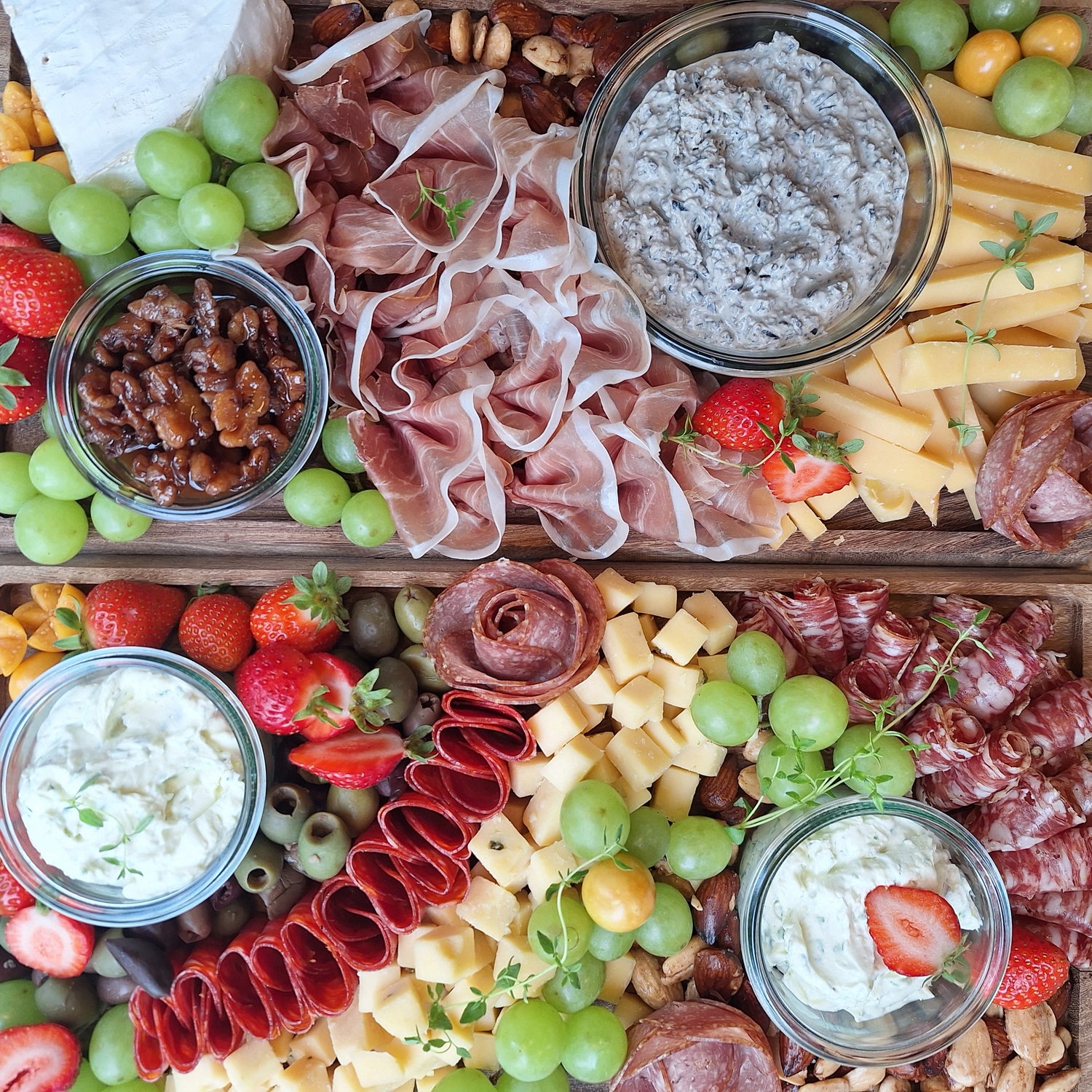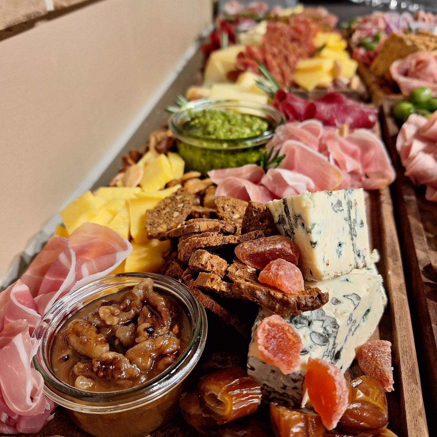 4 luksus oste - sortfodsskinke - 3 slags salami - 2 slags tapenader - oliven - saltmandler - frisk frugt - hjemmebagt surdejsbrød